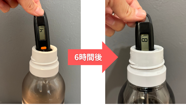 実際に室温で6時間置いた炭酸水の温度を測ってみたところ、8.3℃でした。
