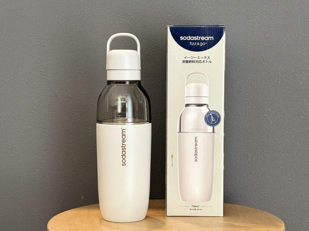 『炭酸飲料対応イージーミックス』は、ソーダストリーム本体に直接取り付けて炭酸水を作り、そのまま持ち運べる保冷ボトルです。