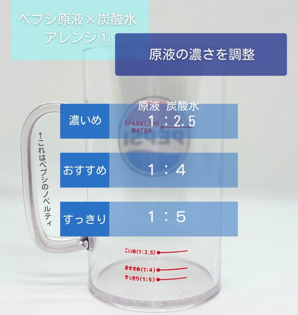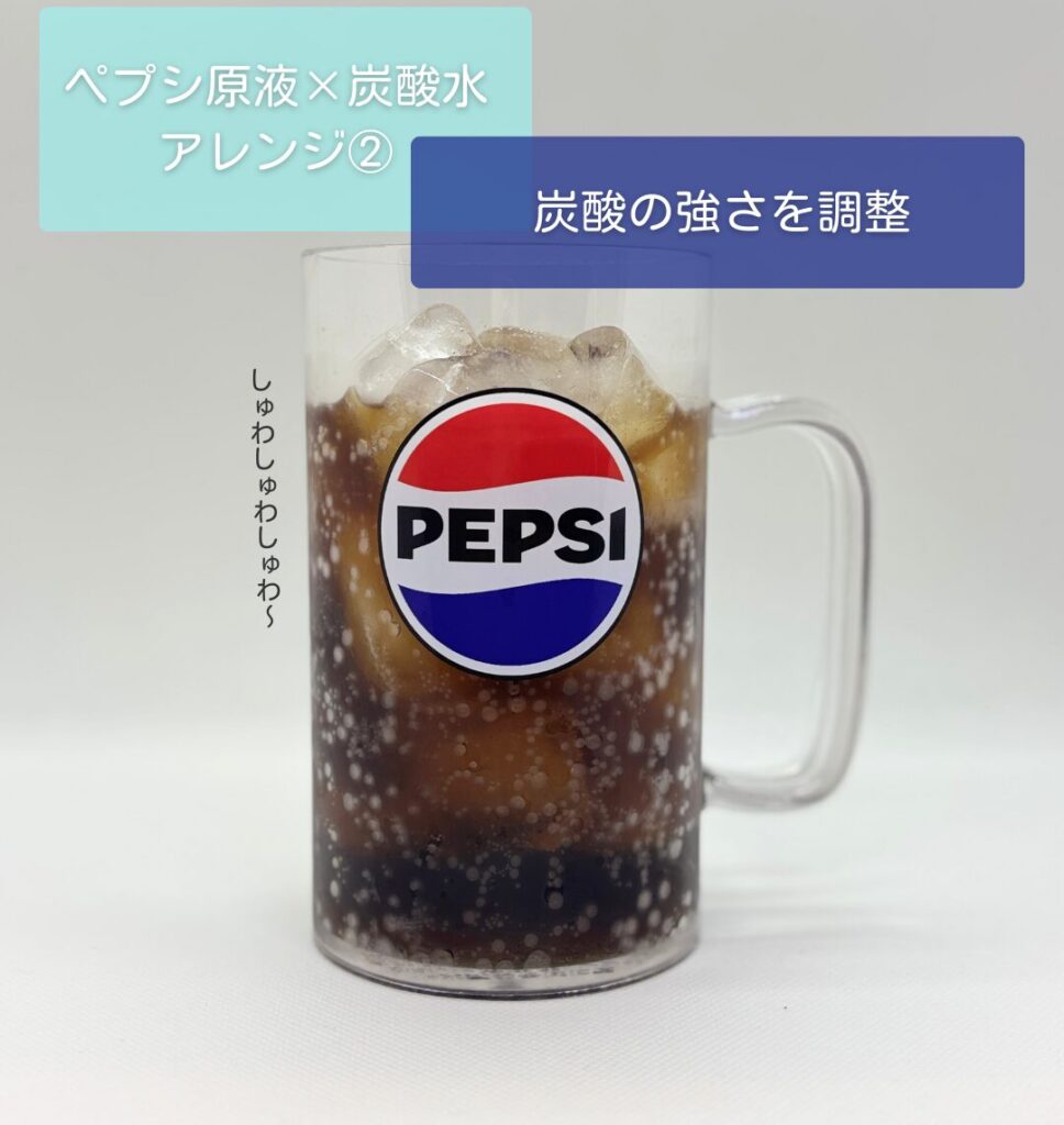 濃くしたいときは炭酸水を少なめに、すっきり飲みたいときは多めに。気分に合わせて好きな濃さのペプシを楽しめちゃいます。