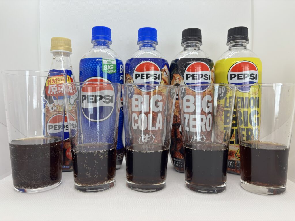 ペプシコーラは左から順に、原液・ペプシコーラ(ノーマルペプシ)・ペプシ〈生〉・ペプシ〈生〉ゼロ・ペプシ〈生〉ゼロレモンがあります。※ペプシコーラには缶タイプもありますが、今回はペットボトルのみで検証しました。