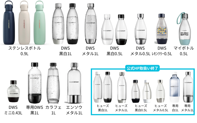 変更している可能性もあるため、ソーダストリーム公式HP「ボトル対応表」での確認もお願いします。